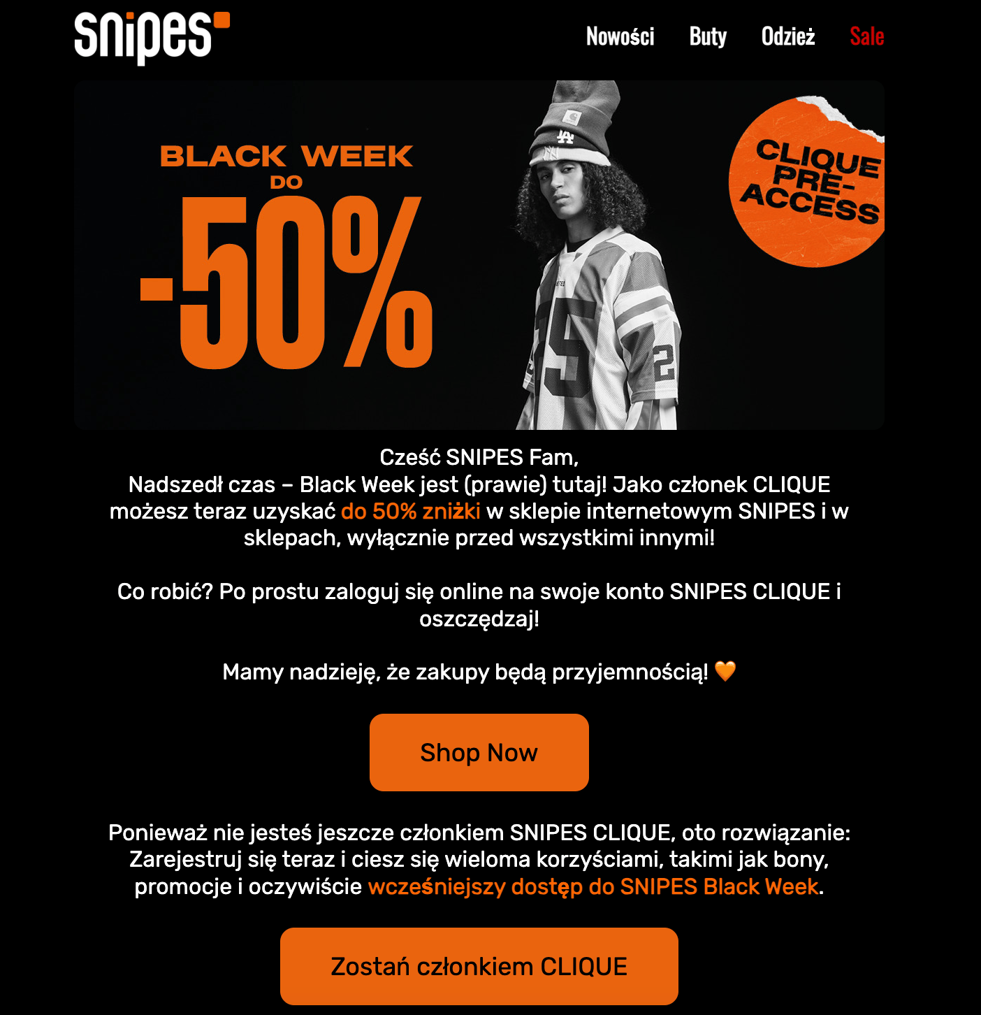 Snipes postawiło na bardzo jasny mechanizm: „Masz konto → masz wcześniejszy dostęp. Nie masz? Zarejestruj się teraz.” Zero ozdobników, pełna bezpośredniość — dokładnie w stylu ich grupy docelowej. Biznesowo to strzał w dziesiątkę, bo: