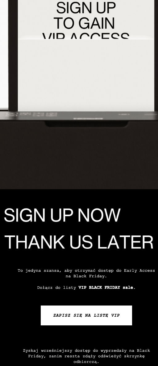 To trend, który obserwuję od kilku lat i który w 2024/2025 stał się absolutnym standardem wśród najlepszych marek. Pre-access (nazywany też VIP access, early access, whitelistą) polega na tym, że klienci mogą z wyprzedzeniem uzyskać dostęp do promocji, pod warunkiem, że spełnią określony warunek: zapiszą się na listę, dołączą do klubu, potwierdzą subskrypcję, zalogują się na konto. W teorii brzmi prosto. W praktyce… to jeden z najbardziej efektywnych mechanizmów psychologicznych wykorzystywanych podczas Black Friday.