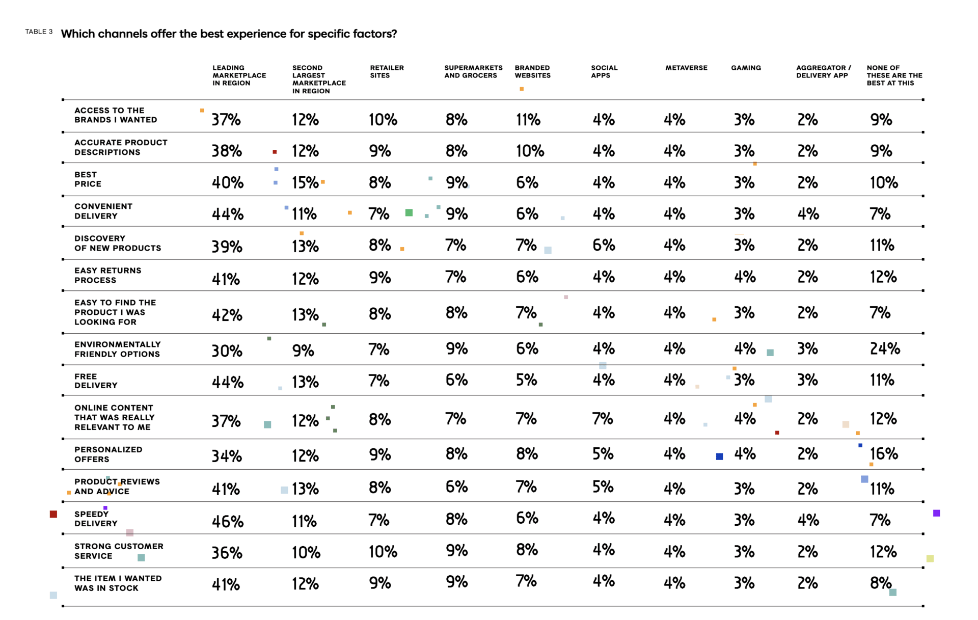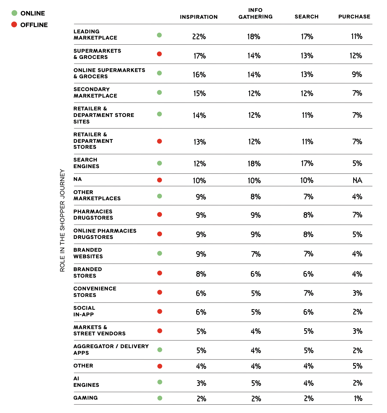 Z poniższego wykresu wynika, że konsumenci poruszają się dziś między kanałami w sposób znacznie bardziej płynny niż jeszcze kilka lat temu. Coraz częściej marketplace’y pełnią rolę miejsca inspiracji i researchu — niemal połowa konsumentów wchodzi tam, by szukać pomysłów lub informacji, a tylko 11% faktycznie dokonuje zakupu. Ścieżka zakupowa nie jest linią – jest siecią mikrodecyzji.