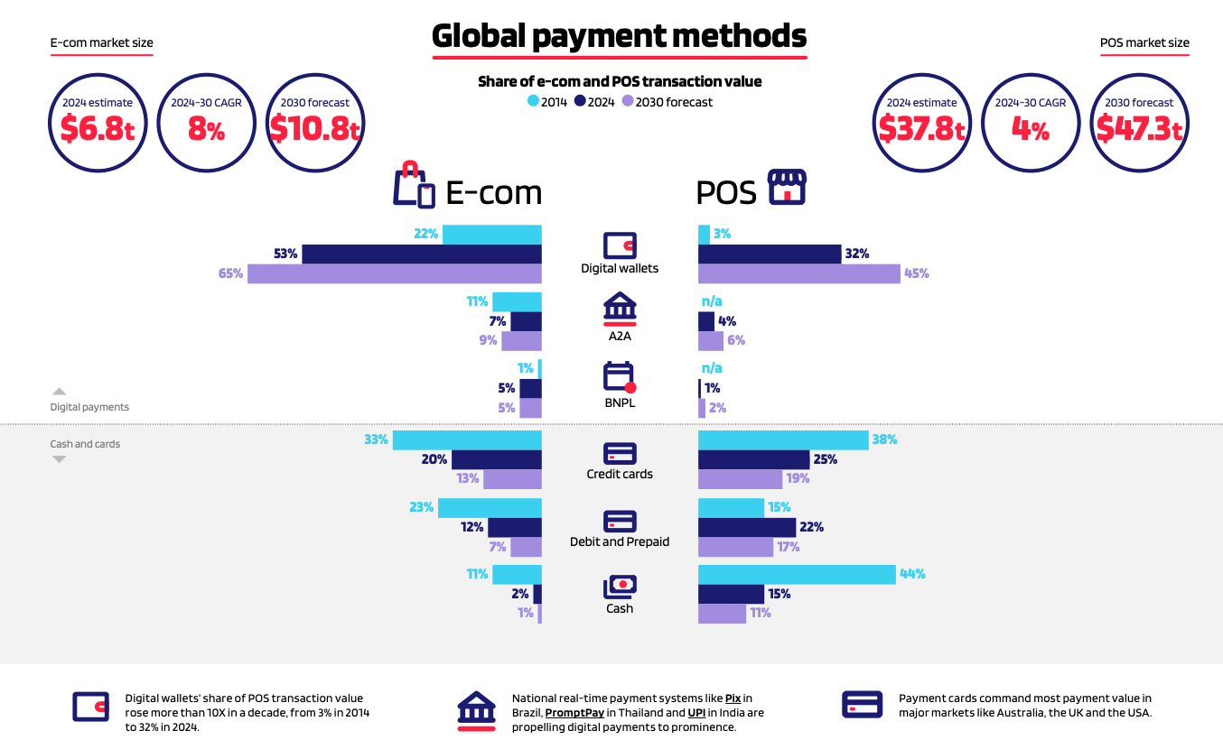 Digital wallets (Apple Pay, Google Pay, Alipay i inne) odpowiadają już za 53% wszystkich transakcji w e-commerce i do 2030 roku mają osiągnąć 65% udziału. Dla porównania, dekadę temu było to zaledwie 22%.