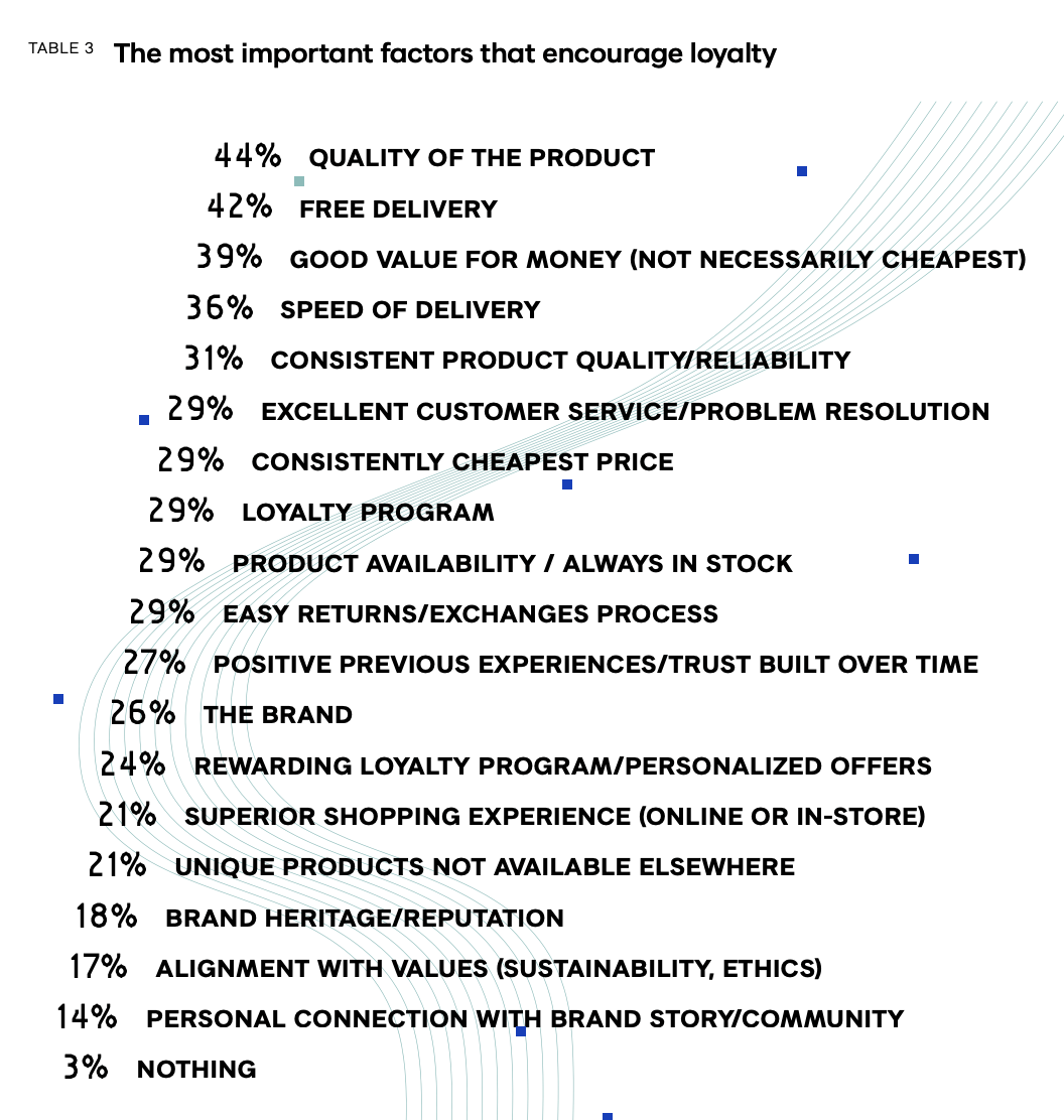 Z raportu The Future Shopper 2025 wynika, że lojalność coraz częściej jest efektem konsekwencji, a nie przywiązania. Najważniejsze czynniki, które sprawiają, że klienci wracają, to: