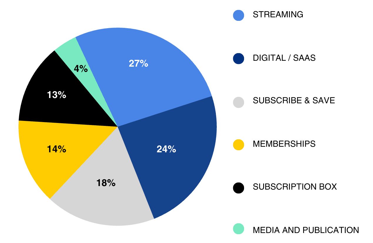 Z danych Fortune Business Insights (2024) wynika, że rynek subskrypcji e-commerce nie ma jednego dominującego modelu — tworzą go różne kategorie odpowiadające na różne potrzeby konsumentów. Największy udział mają dziś: